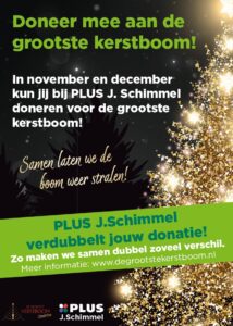Onze sponsor Plus J Schimmel is al langer enthousiast sponsor van De Grootste Kerstboom. Dit jaar komt het statiegeld van flessen, blikjes en kratten ten goede aan de stichting De Grootste Kerstboom. En dat niet alleen, het bedrag wordt ook nog eens verdubbeld voor onze stichting. Helemaal top dus. Stop dus je emballage-bon in de bus naast de flessenautomaat. En samen laten we de boom weer stralen. De actie is al gestart en loopt tot eind december.