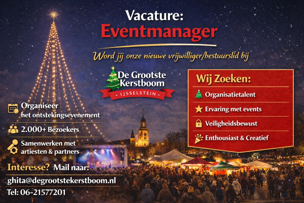 De Eventmanager voor het openingsfeest van Stichting De Grootste Kerstboom in IJsselstein is verantwoordelijk voor de volledige organisatie, coördinatie en uitvoering van dit grootschalige en publiekstrekkende evenement. Het ontsteken van De Grootste Kerstboom is een jaarlijks terugkerend evenement met regionale en landelijke uitstraling, waarbij veiligheid, beleving, samenwerking en strakke regie centraal staan. De eventmanager fungeert […]